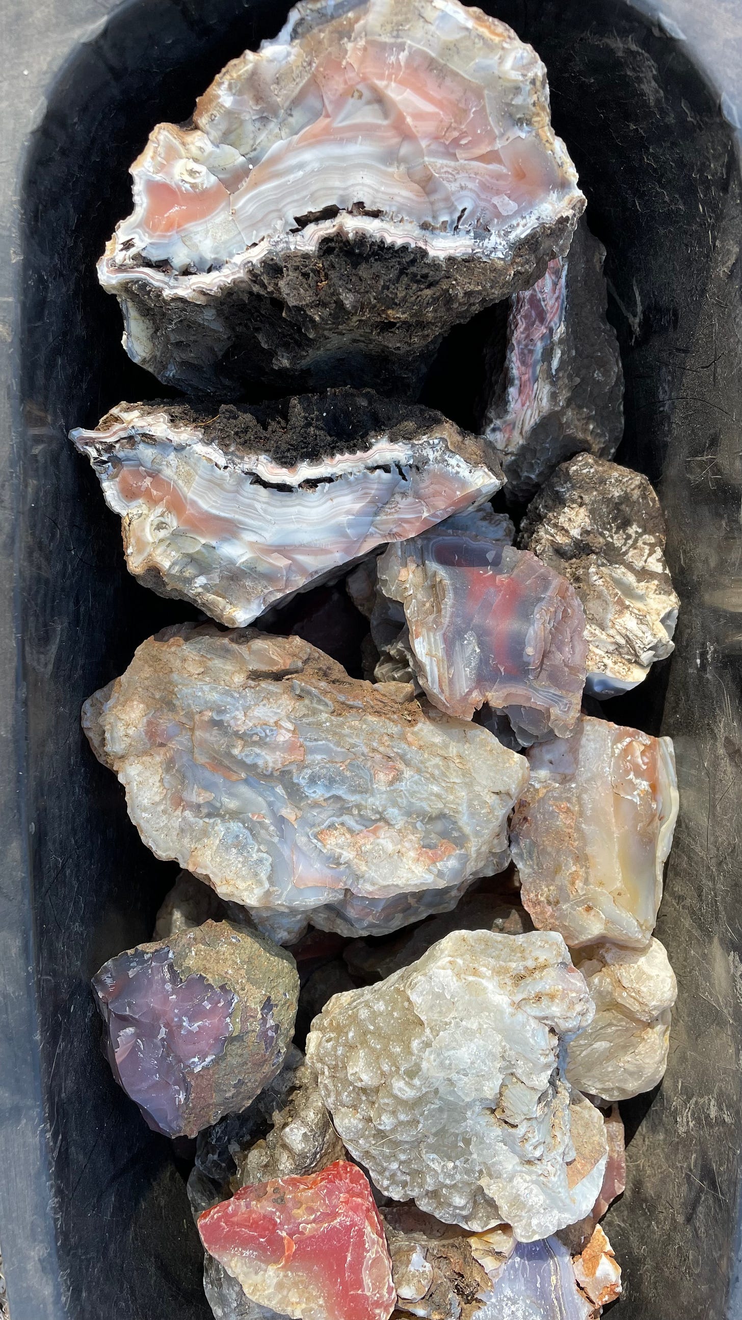 I pick up lots of pieces to put in the tumbler when I return home. By tumbling rocks with a series of grits and then a polish of tin oxide they become smooth and the colour is highlighted. Some specimen rocks I find might come up nicely with some grinding, flat lapping (holding the rock on a flat turn-table with different grits (coarse to fine) and polishing. It can take hours to get a rock revealing its best self.